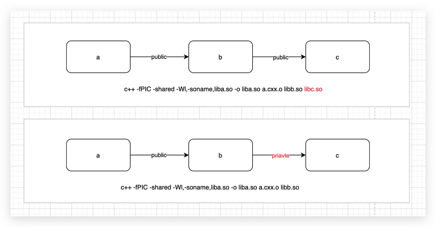 ## c++ -fPIC -shared -Wl,-soname,liba.so -o liba.so a.cxx.o libb.so libc.so