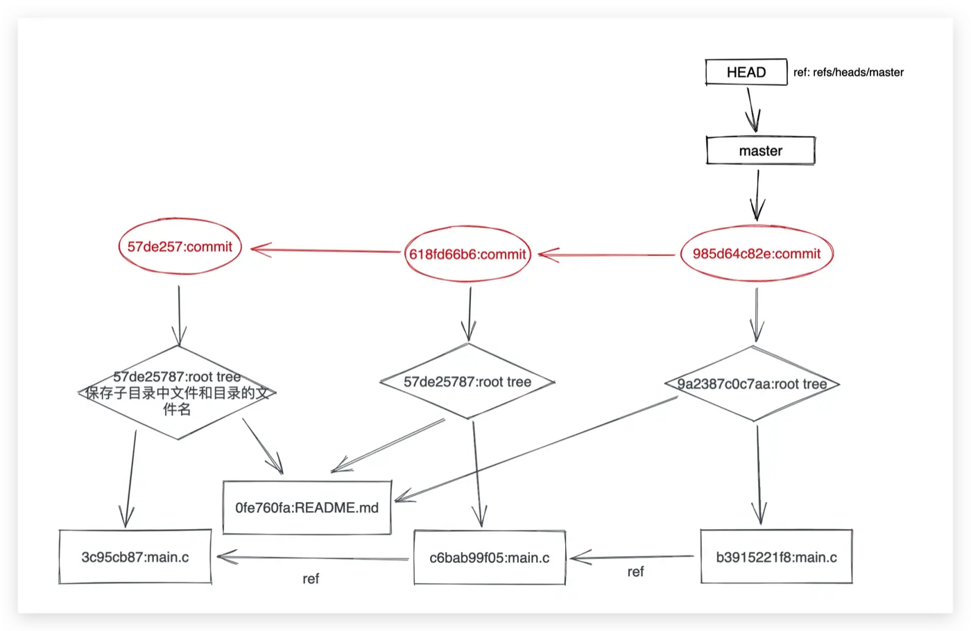$ echo "${commit_hash}" > .git/heads/master # 指定master分支指向的提交对象Git存储结构图
