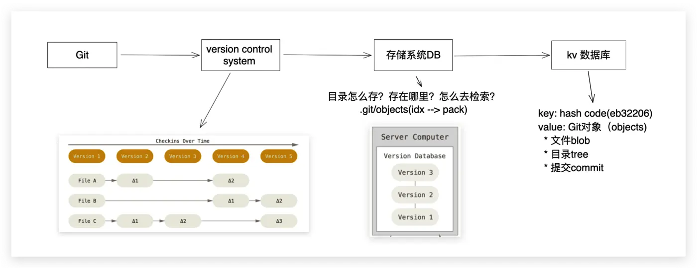以Git对象(文件内容对象、目录对象、提交对象)方式存储;本地存放在.git目录;通过Hash Code去检索